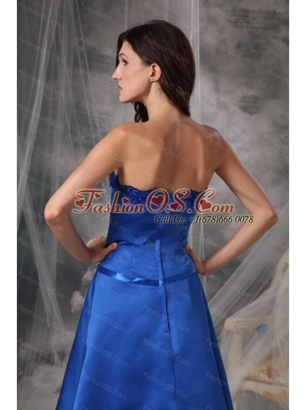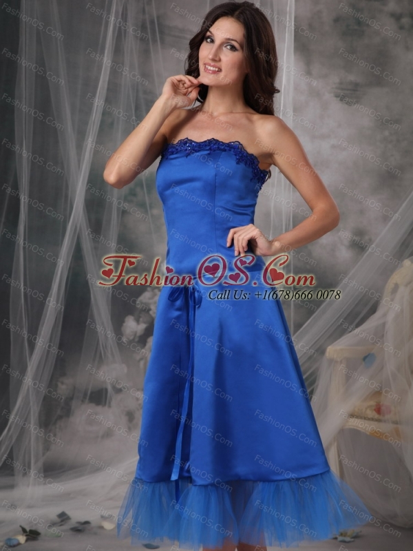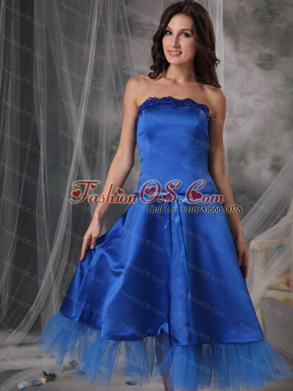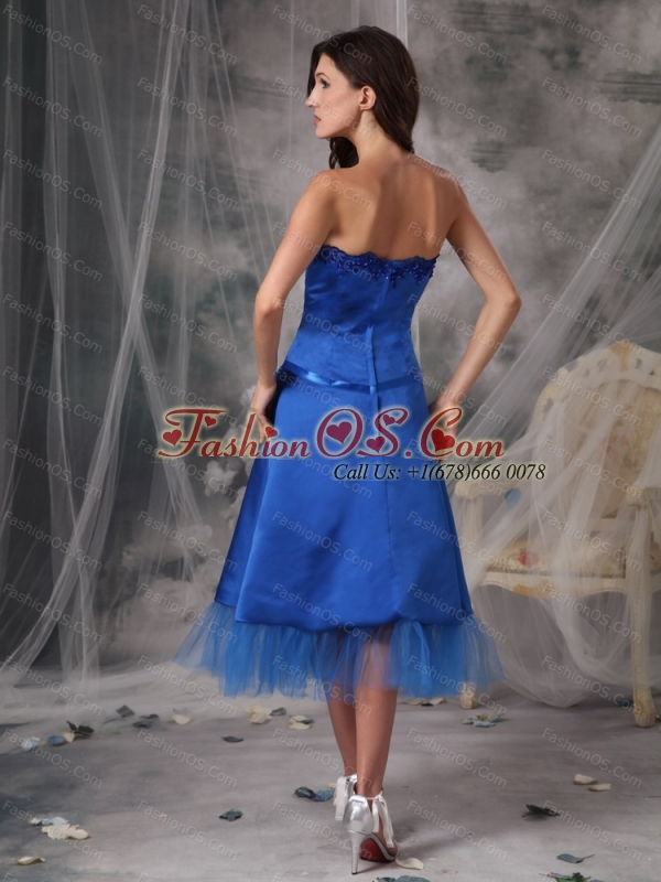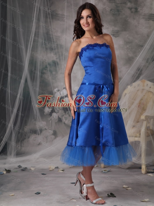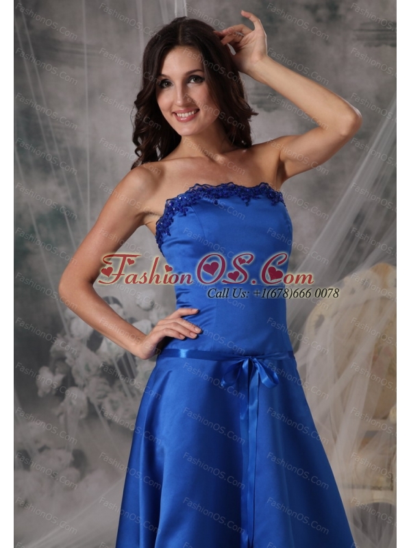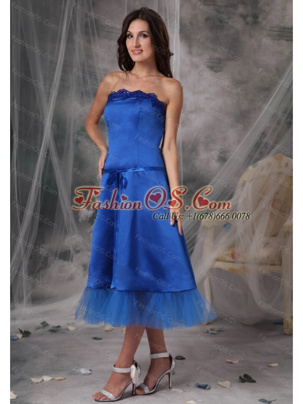 Blue Strapless Tea-length Taffeta Sash Dama Dresses On Sale