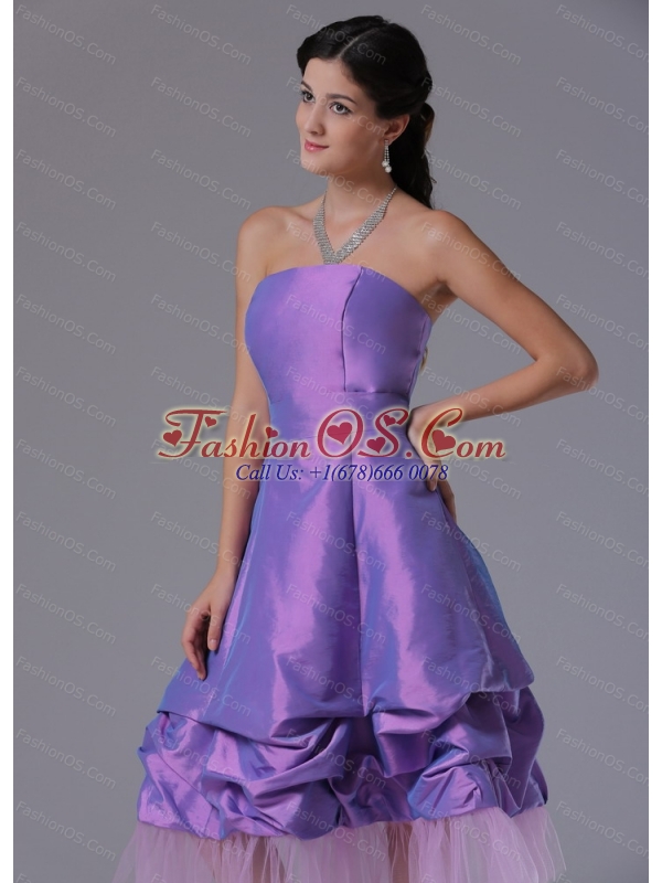 How elegant the dress is! This dress features a strapless bodice. The skirt adorned by ruffles and tulle in the hemline. The sweet bowknot on the back accents your princess temperament. The zipper up back finishes the elegant design.