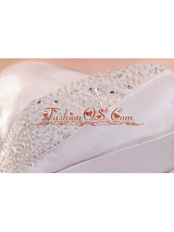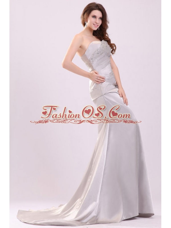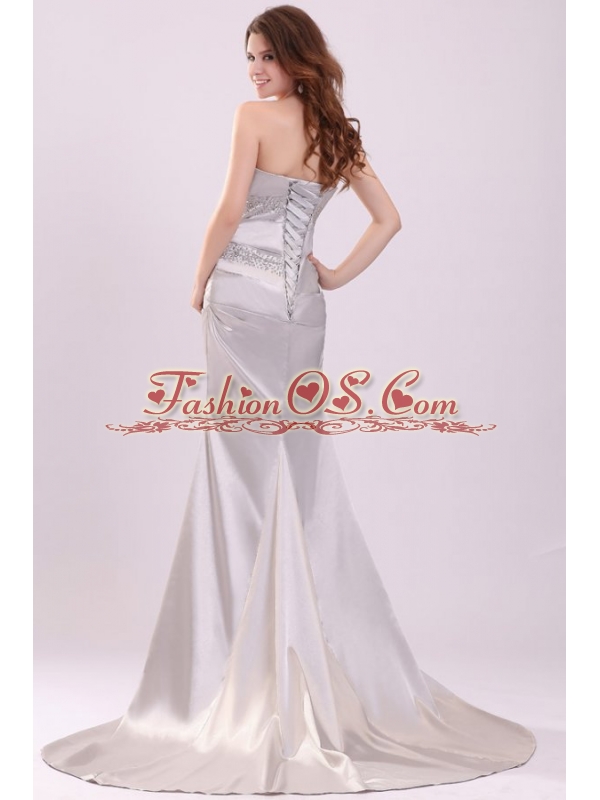 Column Strapless Beading and Ruching Brush Train Prom Dress