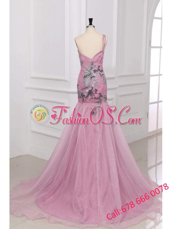 Mermaid One Shoulder Appliques Organza Court Train Pink Prom Dress