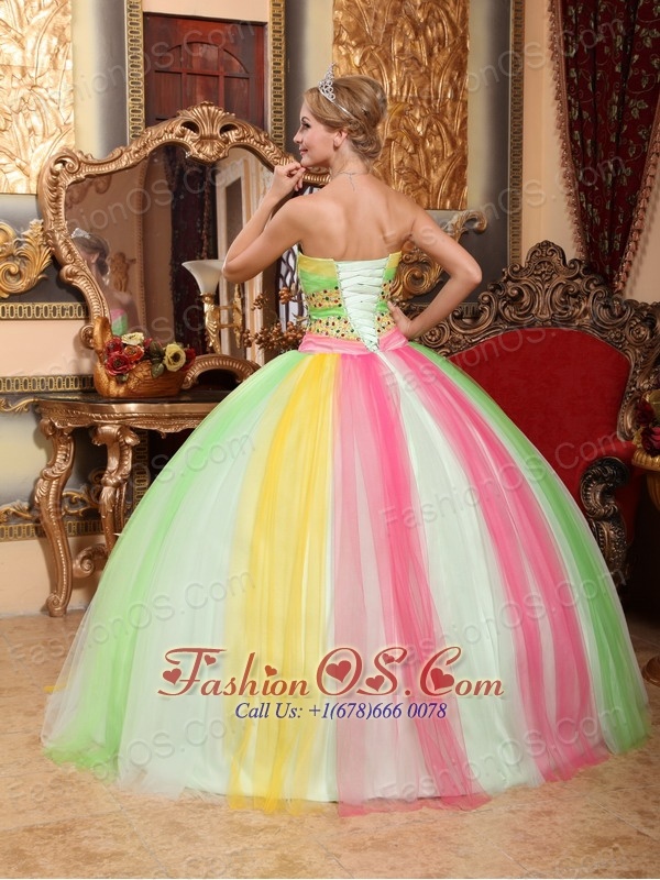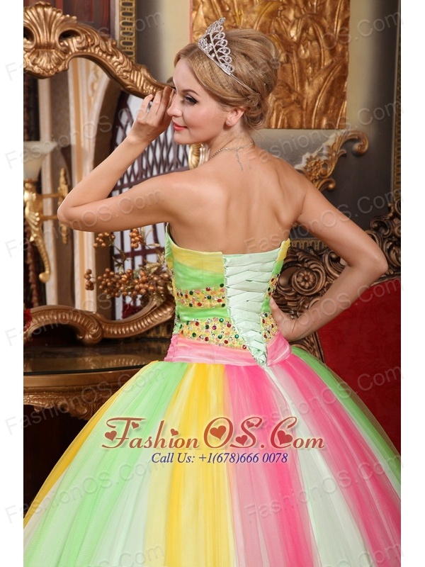 Just be a fairy maiden in this colorful ball gown. Fabulous is the only word came to my mind when I saw it. The dress features A sweetheart neckline with some colorful beadings accented on the bodice.several different colors of tulle which make the dress like a rainbow falls freely to complete the look.