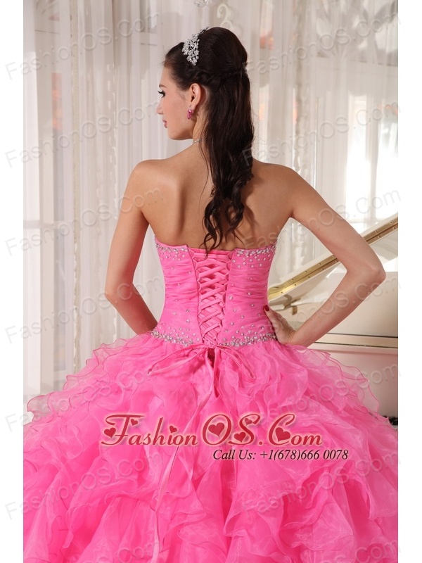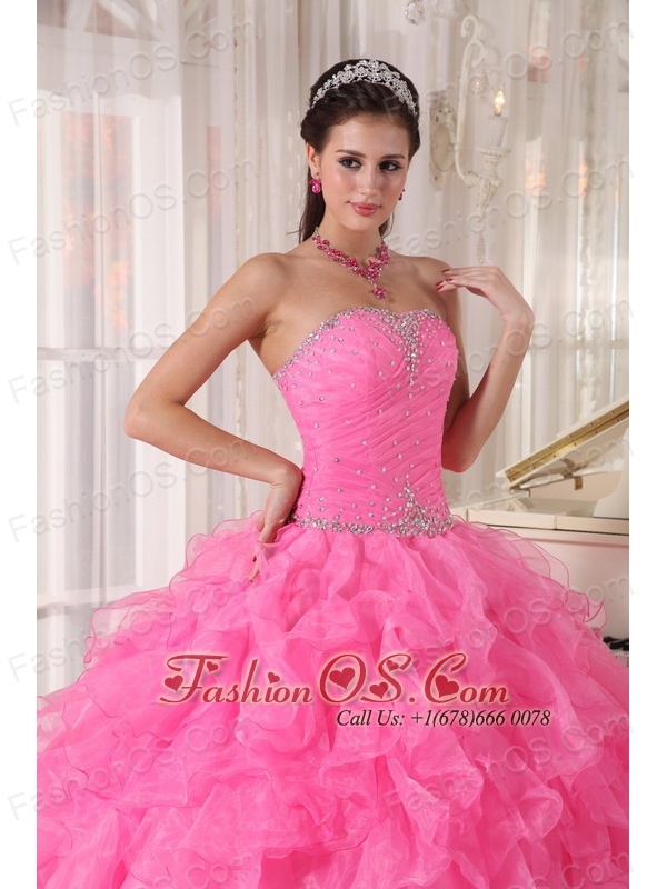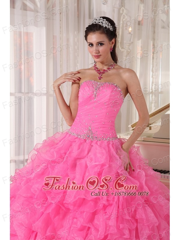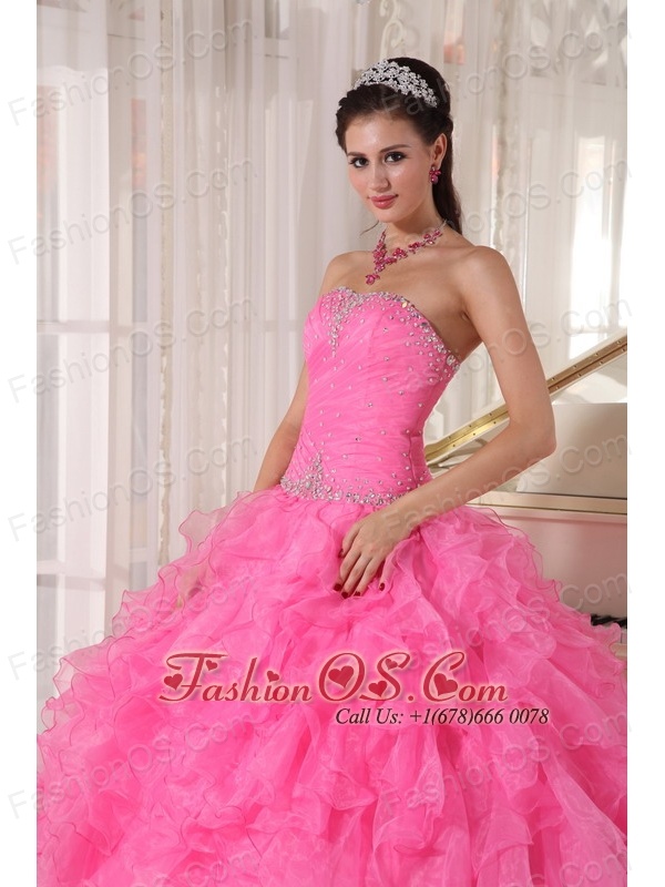 Inexpensive Rose Pink Quinceanera Dress Strapless Organza Beading Ball Gown
