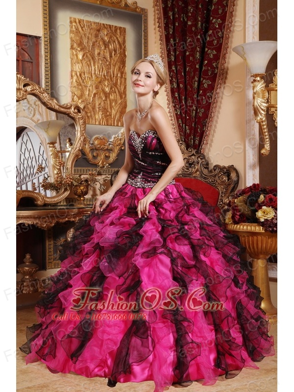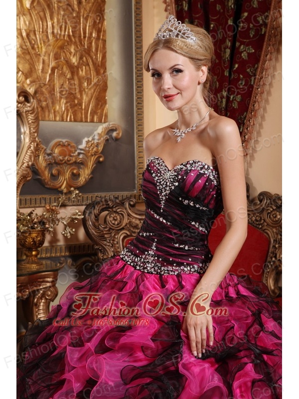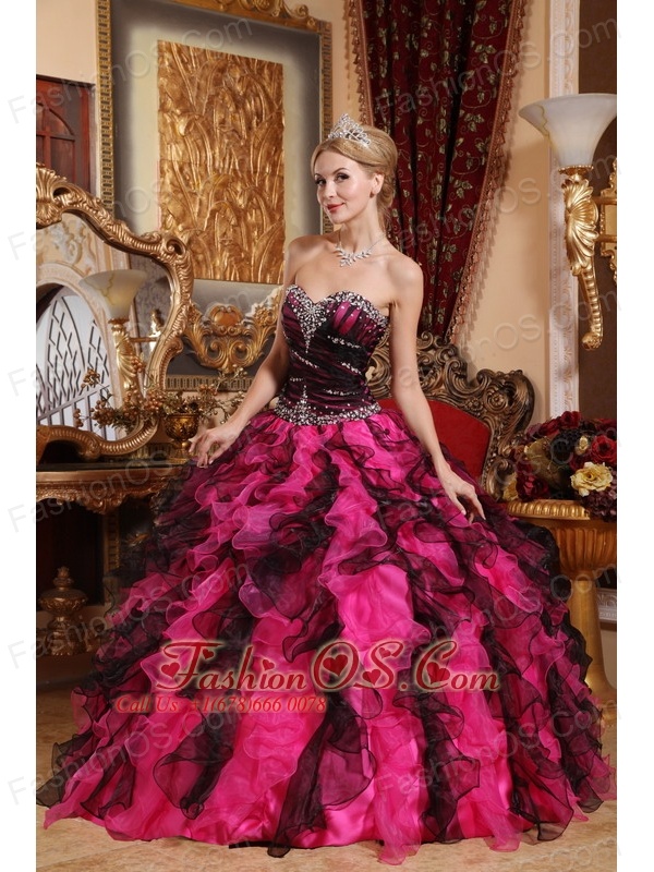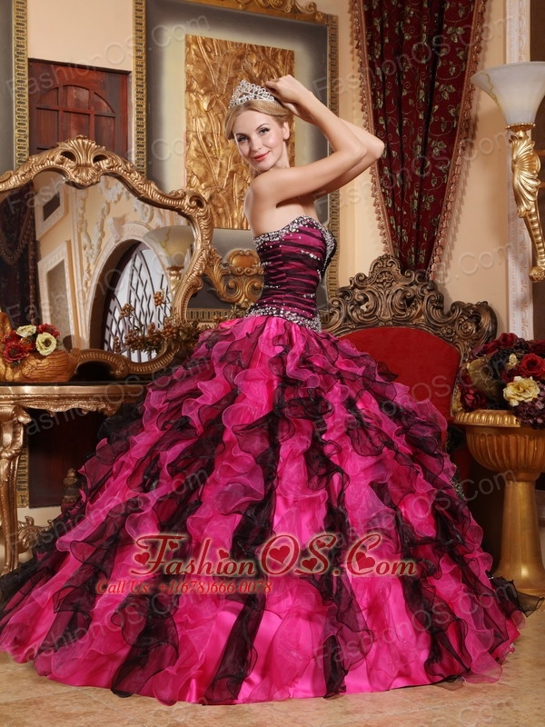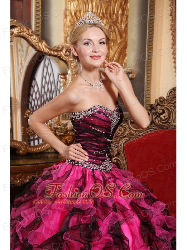 Popular Black and Hot Pink Quinceanera Dress Sweetheart Organza Beading and Ruffles Ball Gown