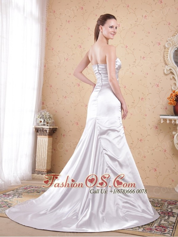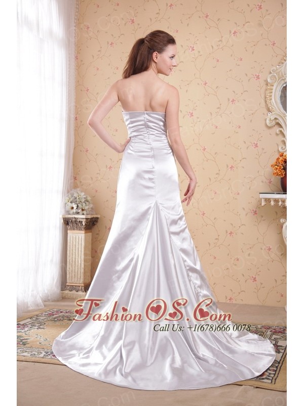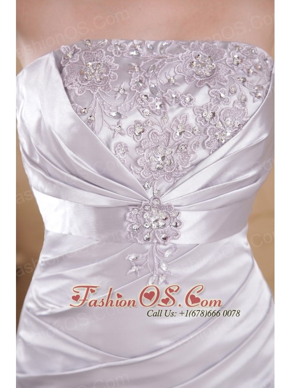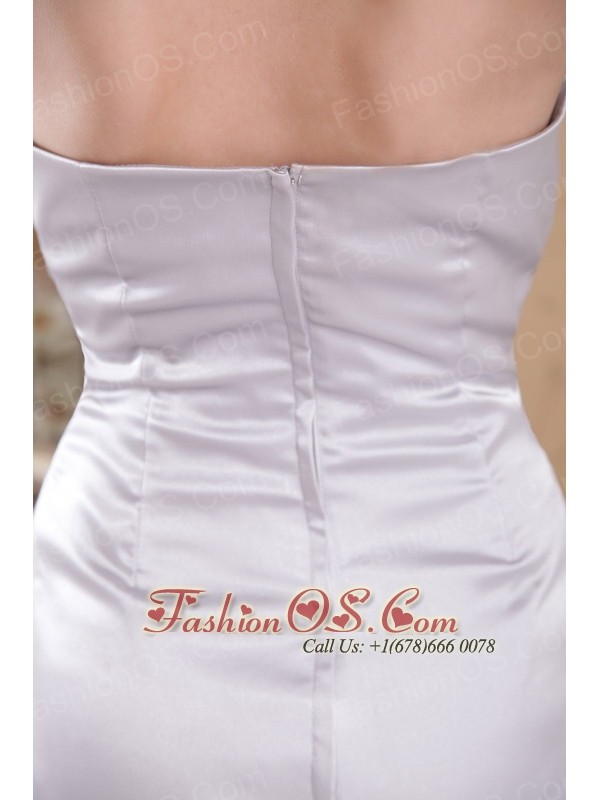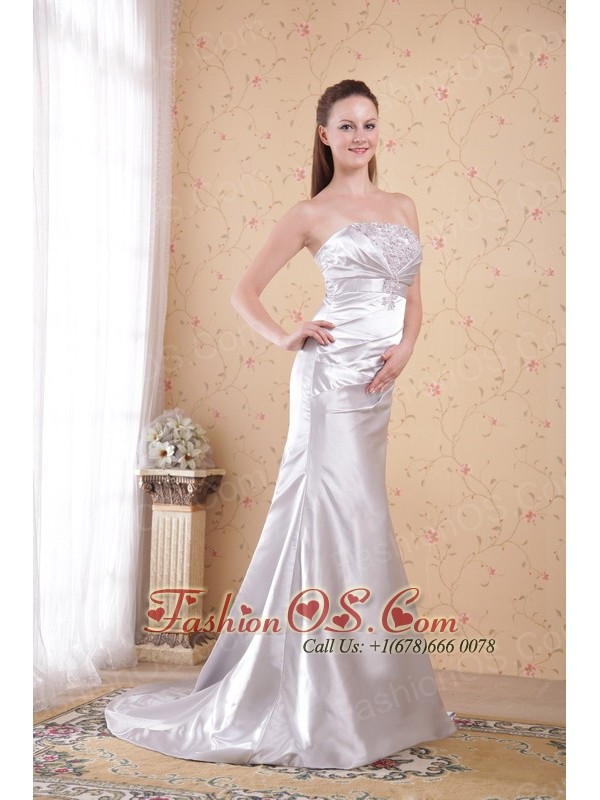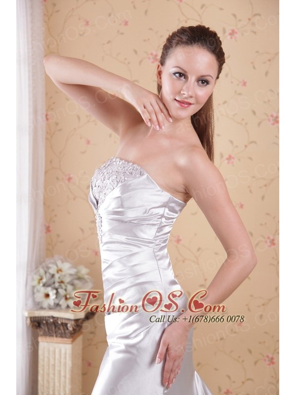 Grey Column Strapless Court Train Satin Appliques and Ruch Prom Dress