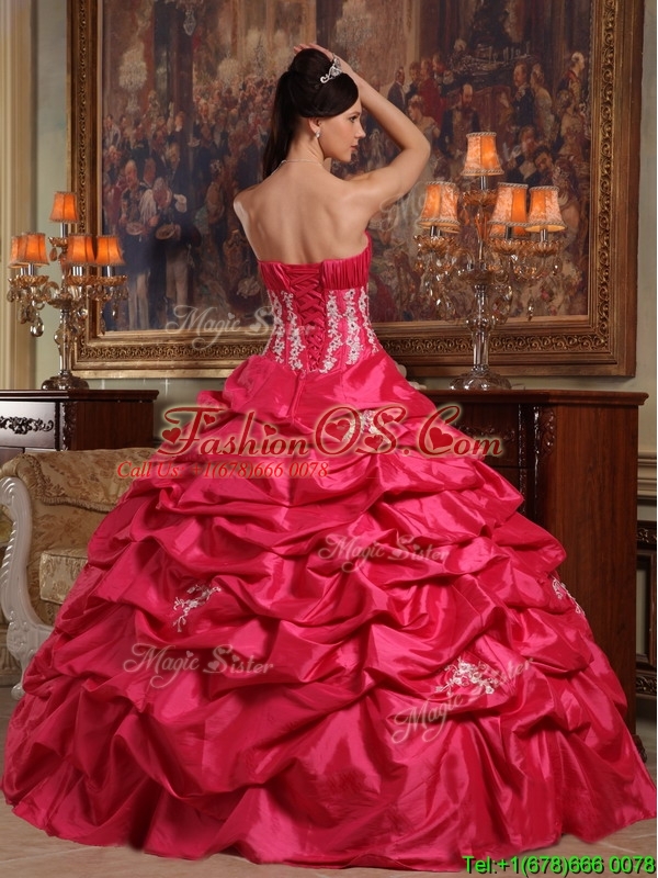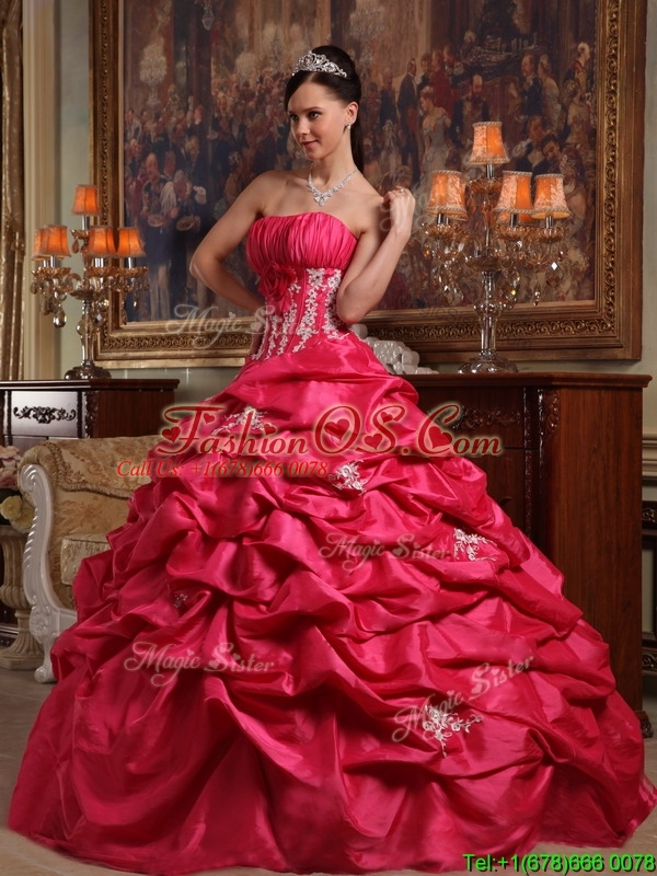 Cheap Coral Red Strapless Quinceanera Gowns with Appliques