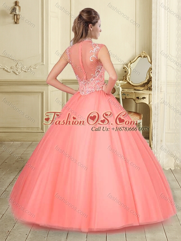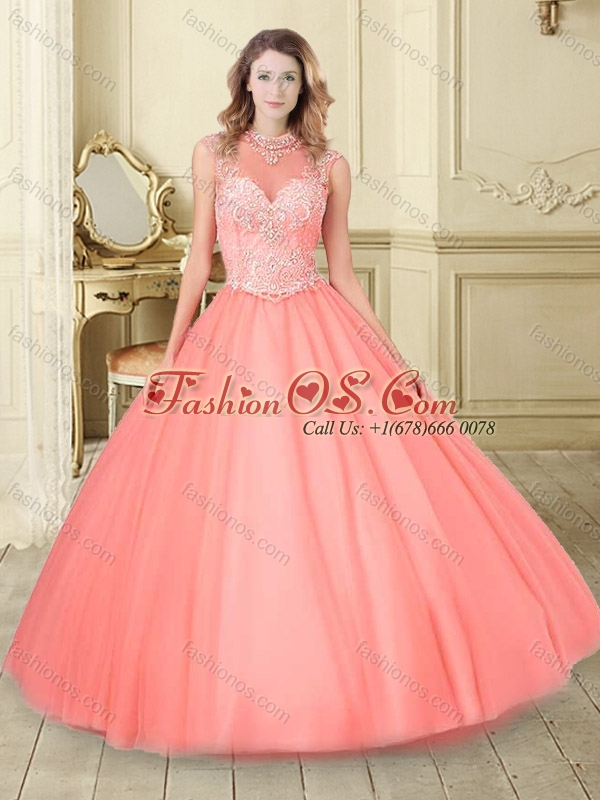 Modest See Through High Neck Quinceanera Dress with Beading and Appliques
