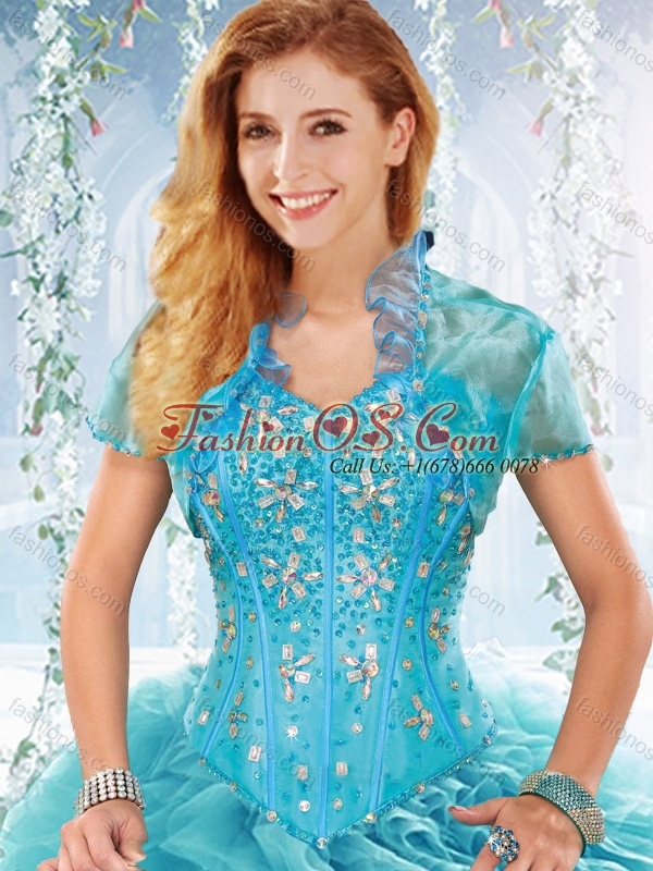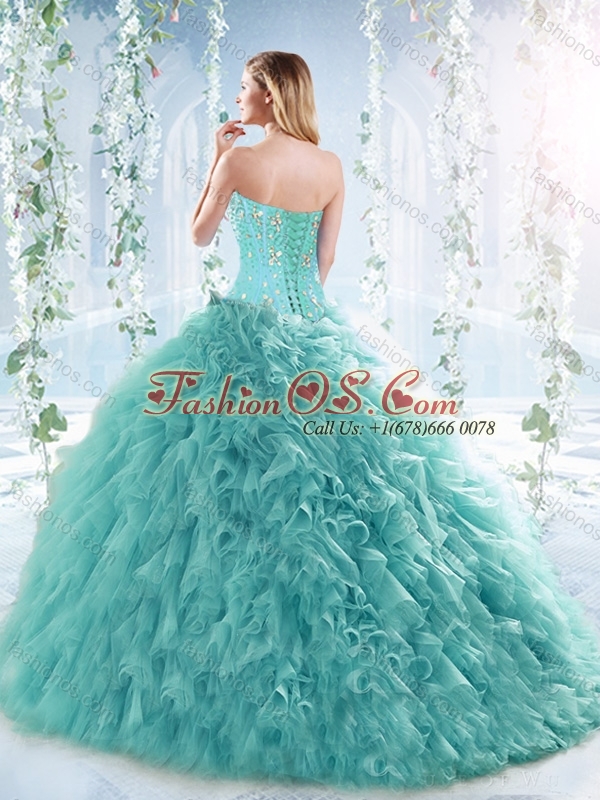 Unique Beaded and Ruffled Aquamarine Detachable Quinceanera Dress with Brush Train
