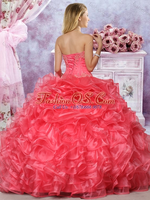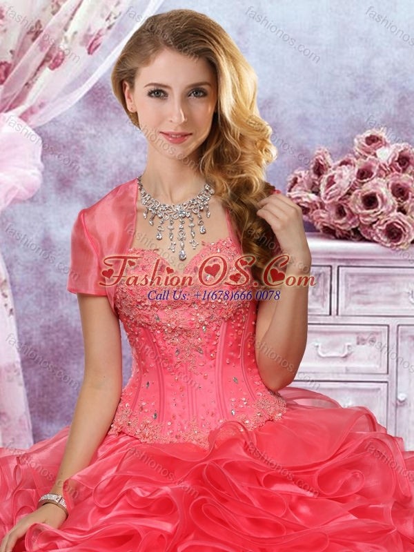 Cheap Beaded and Ruffled Coral Red SQuinceanera Dresses in Organza