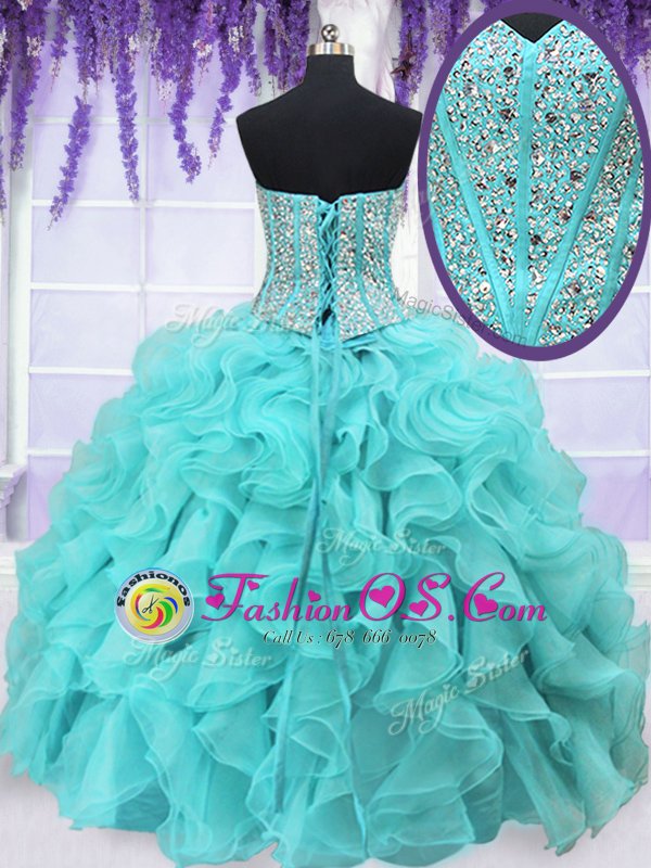 Great Four Piece Organza Sweetheart Sleeveless Lace Up Ruffles and Sequins Quinceanera Dresses in Aqua Blue