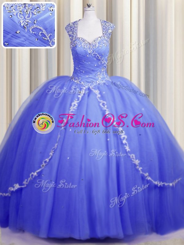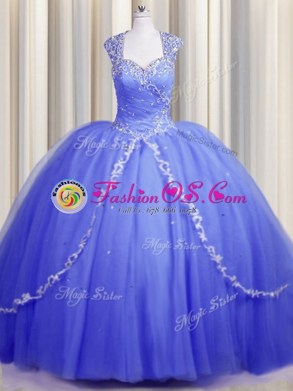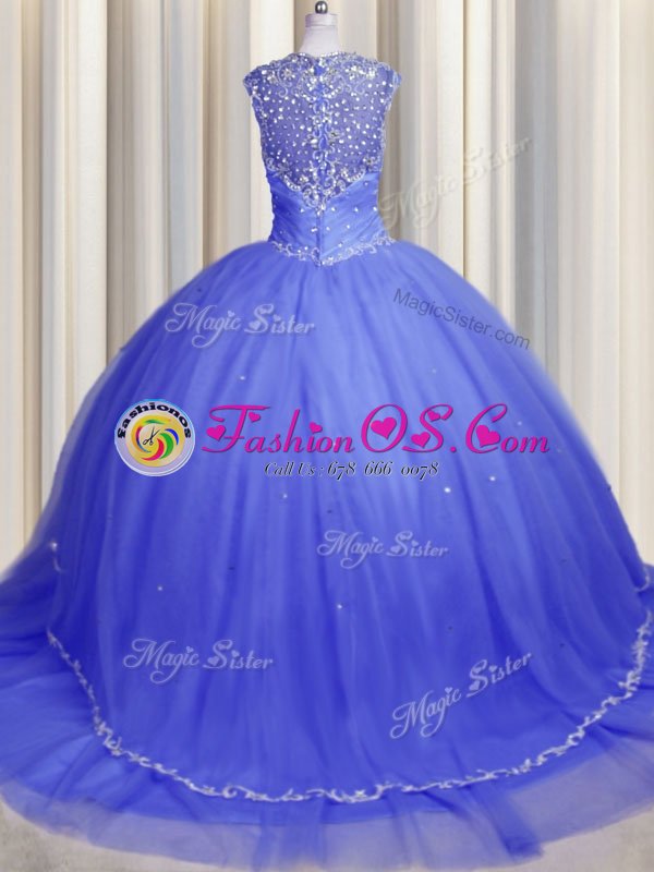 Glorious Ball Gowns Sleeveless Blue 15 Quinceanera Dress Brush Train Lace Up