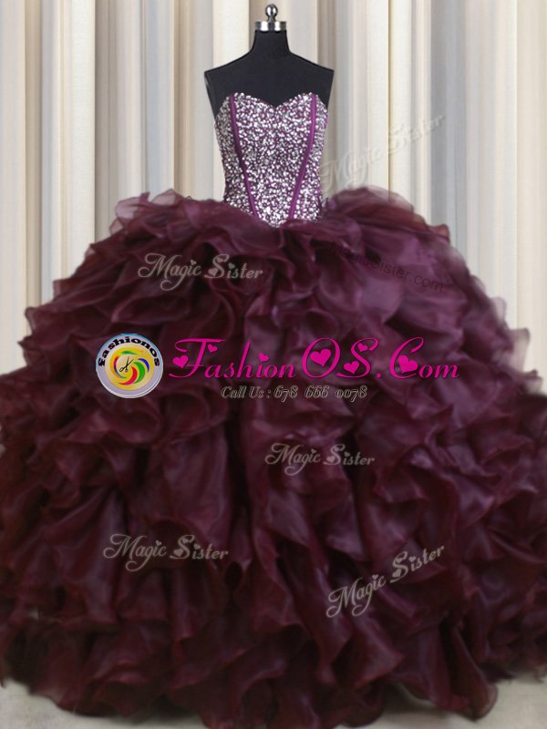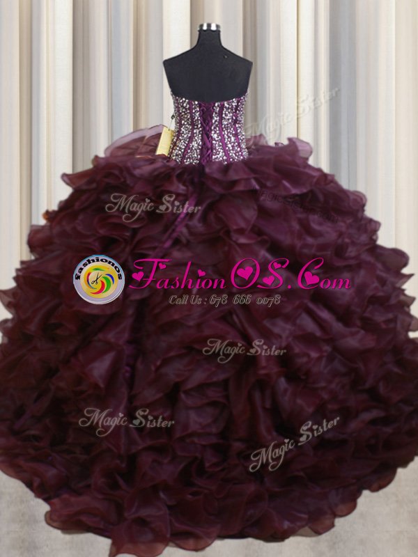 Fine Visible Boning Sleeveless Brush Train Lace Up With Train Beading and Ruffles Quince Ball Gowns