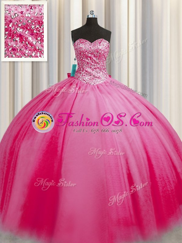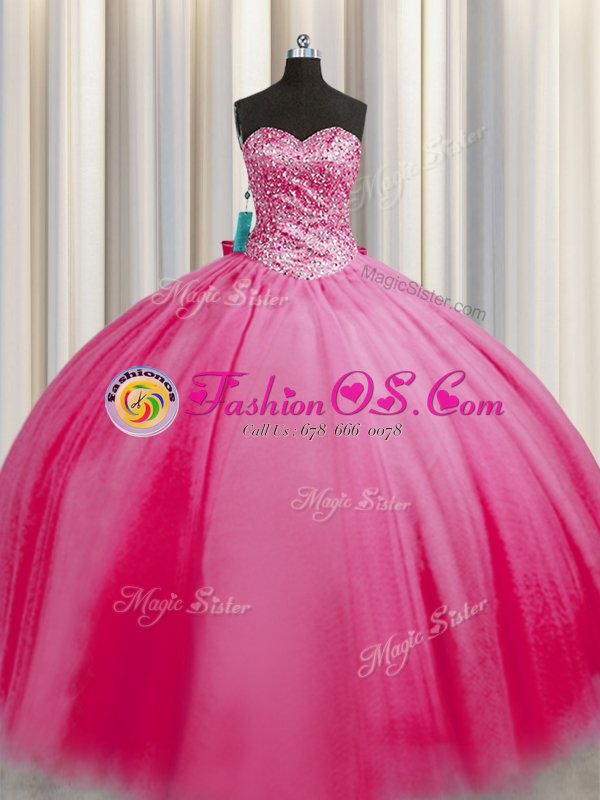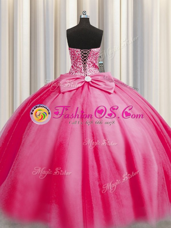 Clearance Big Puffy Rose Pink Sleeveless Floor Length Beading Lace Up Sweet 16 Quinceanera Dress