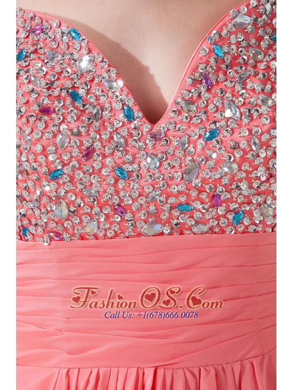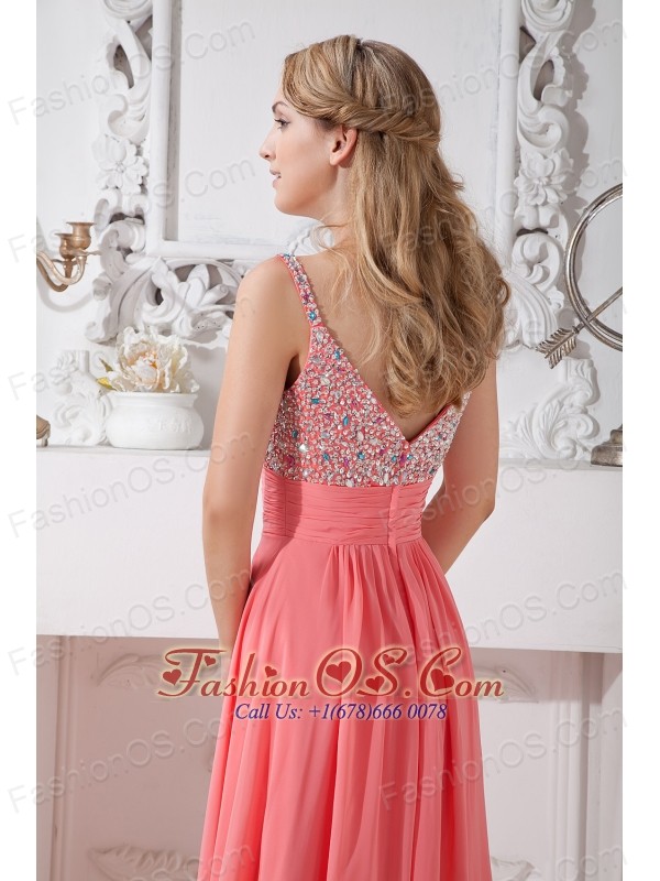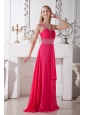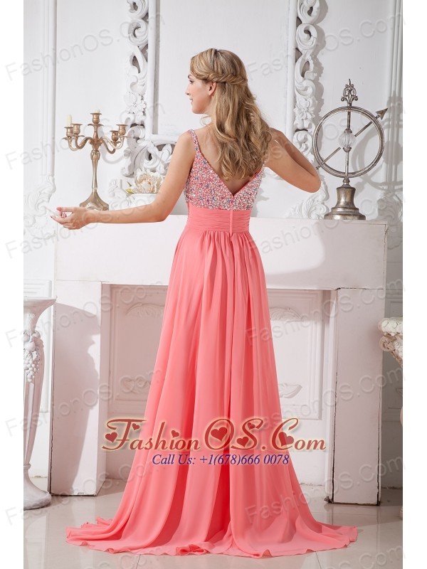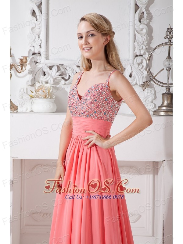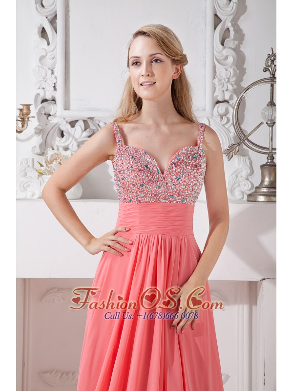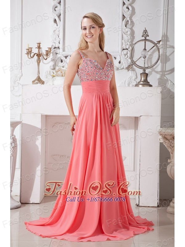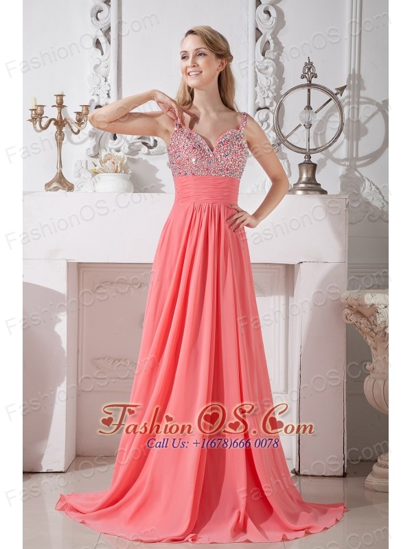 Watermelon Red Spaghetti Straps Chiffon Prom Dress Brush Train Homecoming Gown