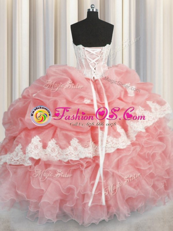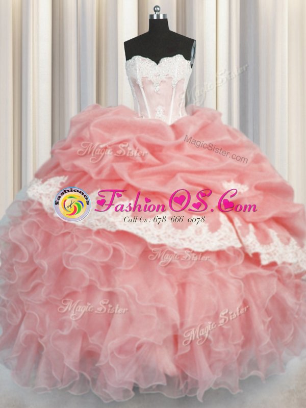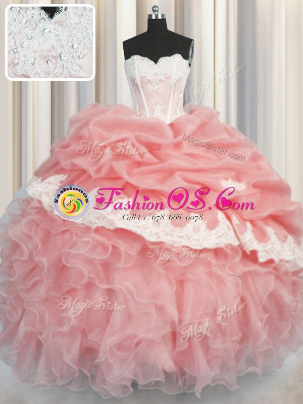 Watermelon Red and Baby Pink Ball Gowns Sweetheart Sleeveless Organza Floor Length Lace Up Appliques and Ruffles and Pick Ups Quinceanera Gowns