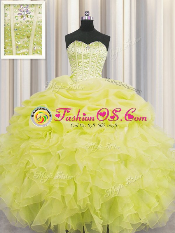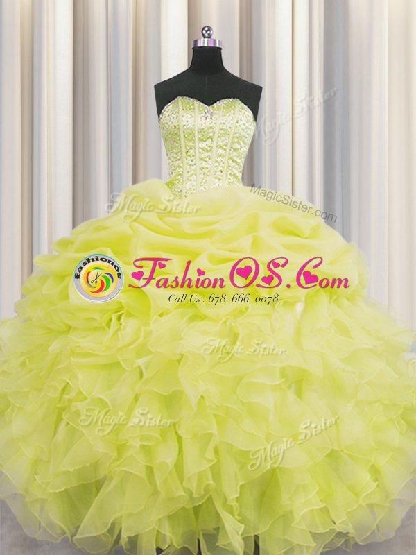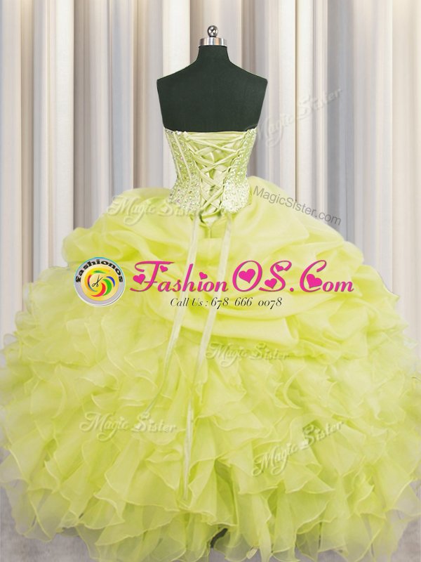 Fantastic Visible Boning Yellow Organza Lace Up Quinceanera Dress Sleeveless Floor Length Beading and Ruffles and Pick Ups
