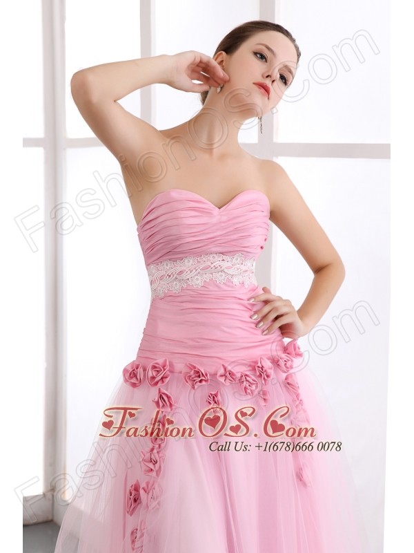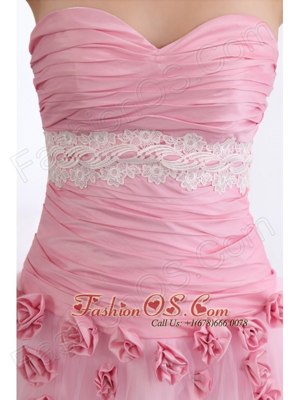 This beautiful sheath-style pink wedding dress is made from taffeta and features a lovely lace sash below the pleated bust, a sweetheart neckline and a pretty and romantic handmade rose around the midsection accents the waistline. The floor-length skirt falls in soft clean lines to the floor in multiple sheer layers, which adds to its fullness and beauty.