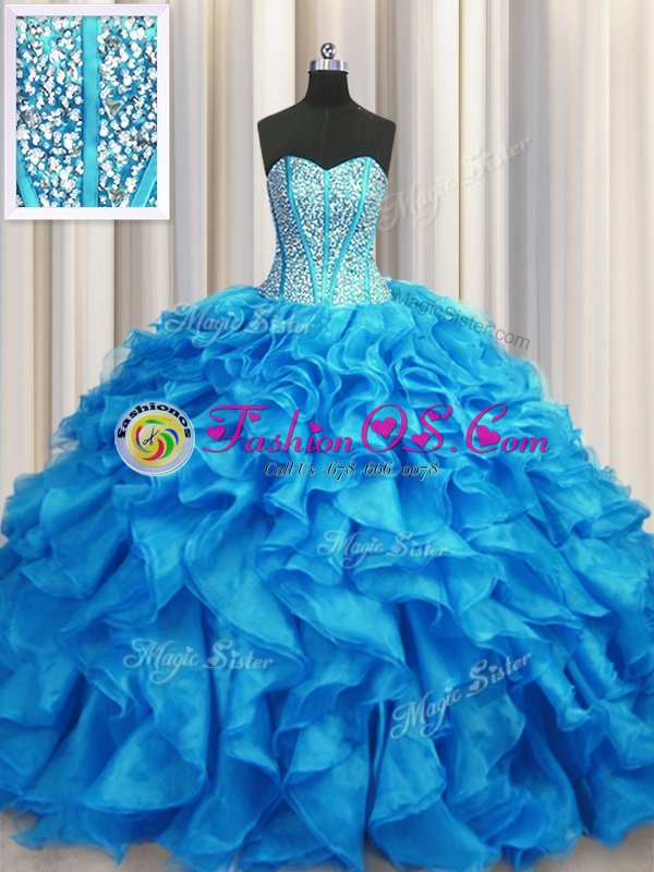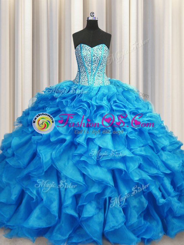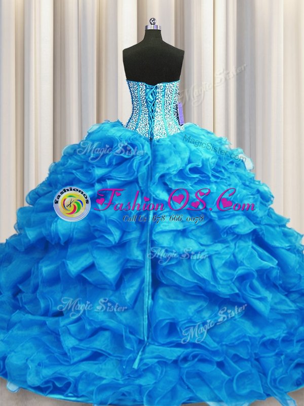 Perfect Visible Boning Baby Blue Sleeveless Organza Brush Train Lace Up Sweet 16 Quinceanera Dress for Military Ball and Sweet 16 and Quinceanera