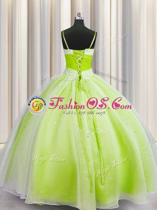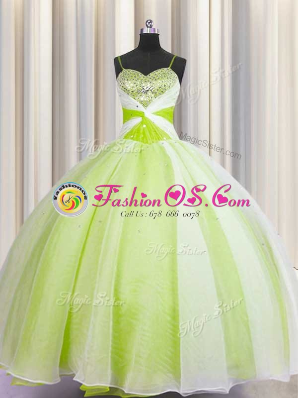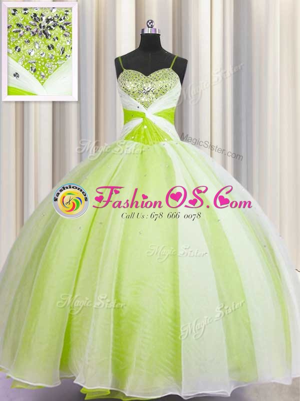 Luxury Spaghetti Straps Sleeveless Floor Length Beading and Ruching Lace Up Sweet 16 Quinceanera Dress with Yellow Green