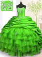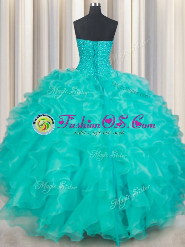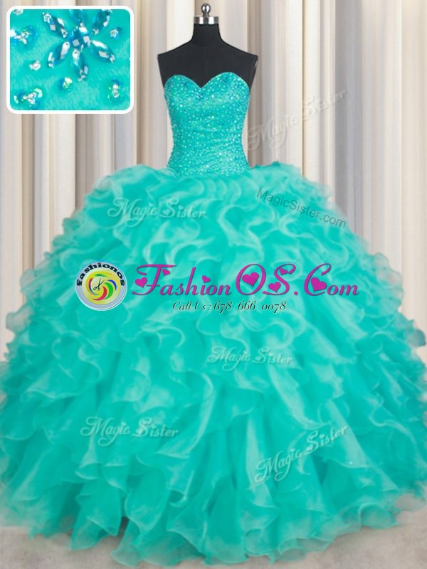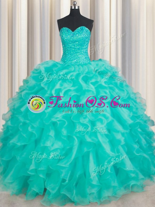 Shining Turquoise Organza Lace Up Quinceanera Gowns Sleeveless Floor Length Beading and Ruffles