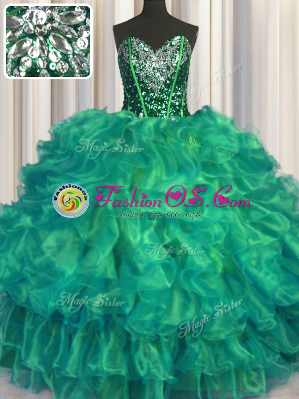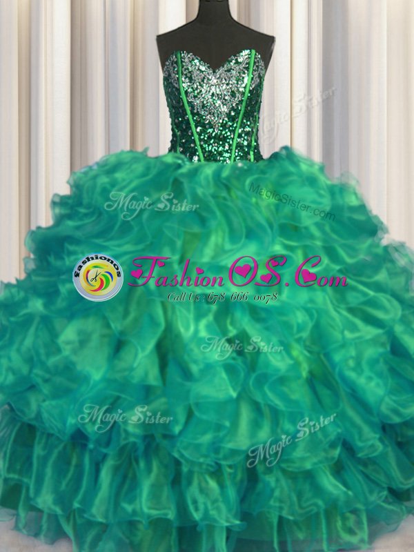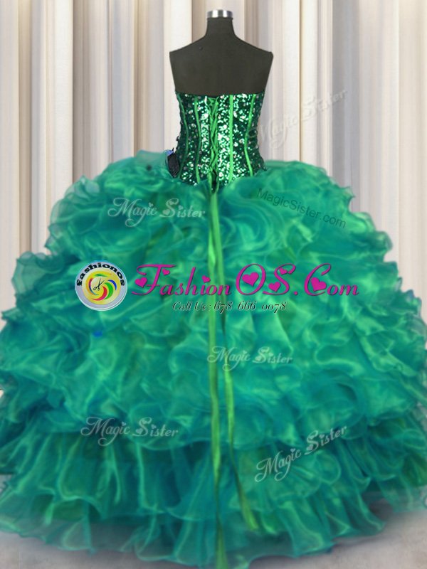 Exquisite Turquoise Ball Gowns Beading and Ruffles Quinceanera Gown Lace Up Organza Sleeveless Floor Length
