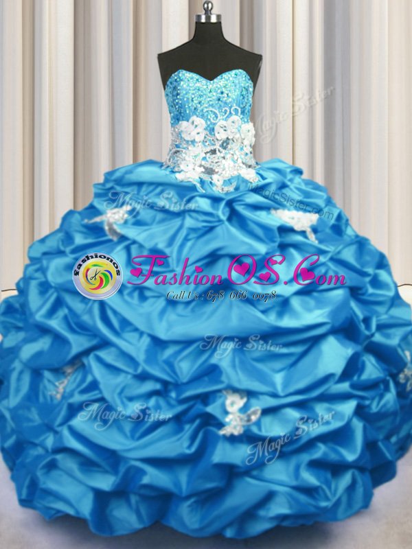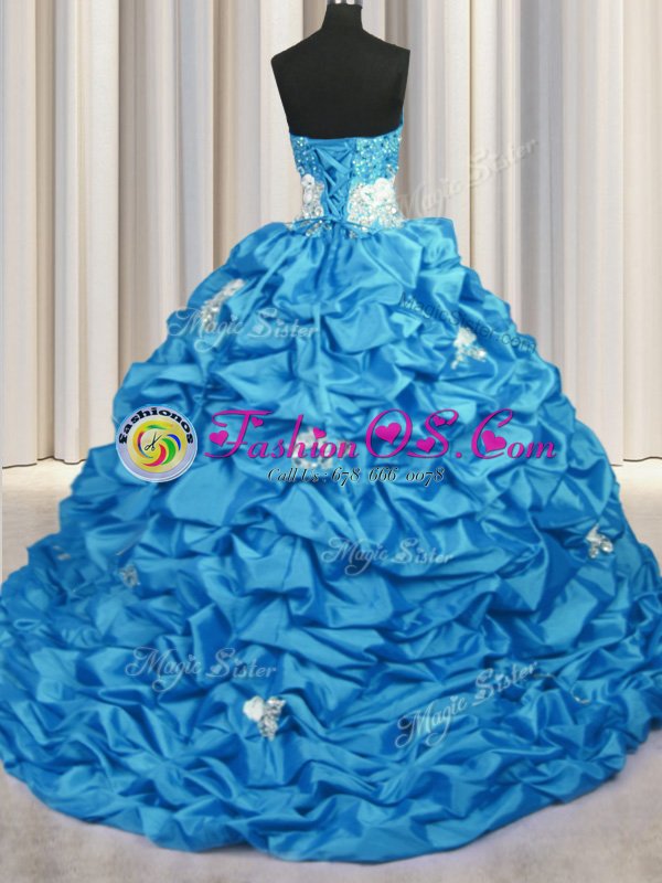 Trendy Aqua Blue Sleeveless With Train Appliques and Sequins and Pick Ups Lace Up Quinceanera Gown