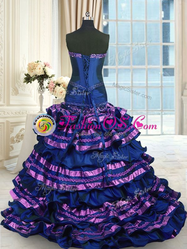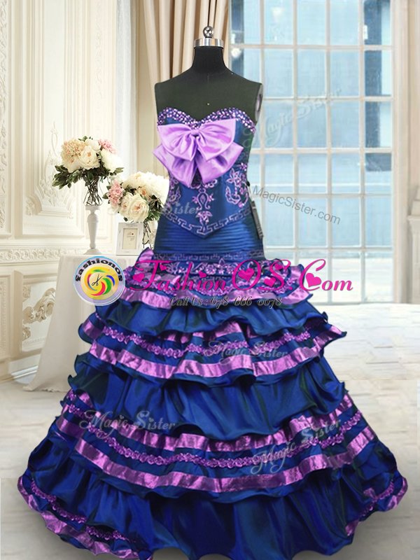 Best Selling Navy Blue Taffeta Lace Up 15 Quinceanera Dress Sleeveless Brush Train Appliques and Ruffled Layers and Bowknot