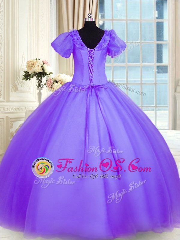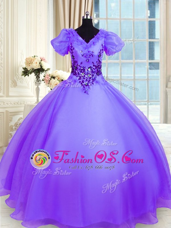 Cheap Ball Gowns Vestidos de Quinceanera Lavender V-neck Organza Short Sleeves Floor Length Lace Up