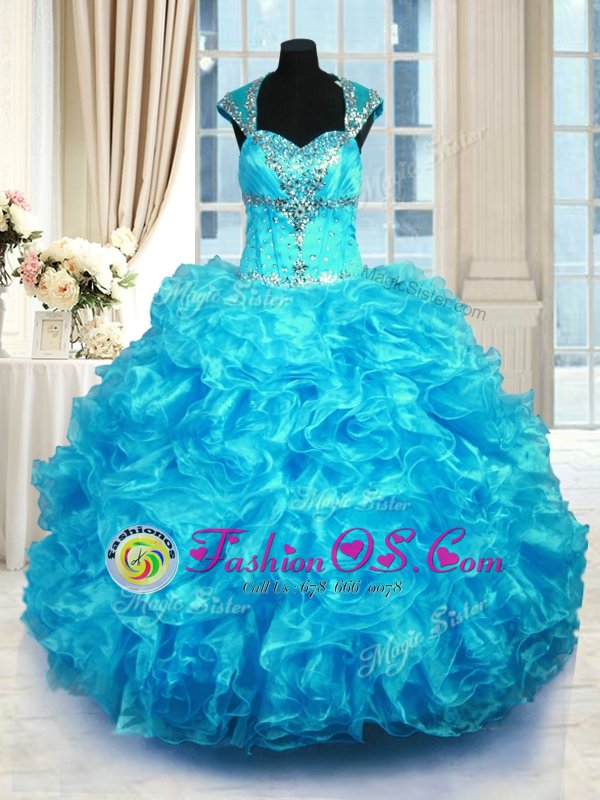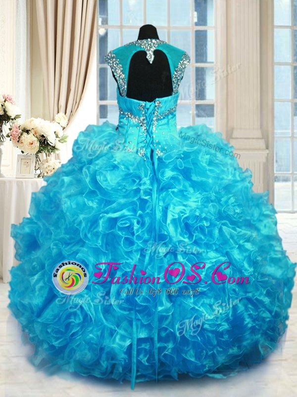 Hot Sale Organza Cap Sleeves Floor Length 15th Birthday Dress and Beading and Ruffles