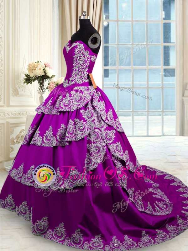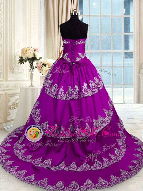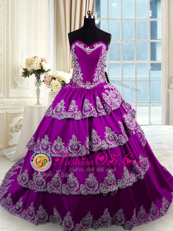 Eggplant Purple Sleeveless Beading and Appliques and Ruffled Layers With Train Sweet 16 Dresses
