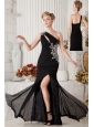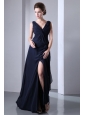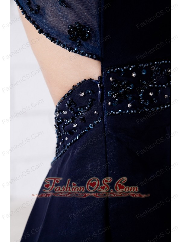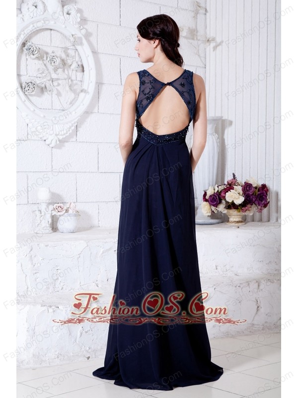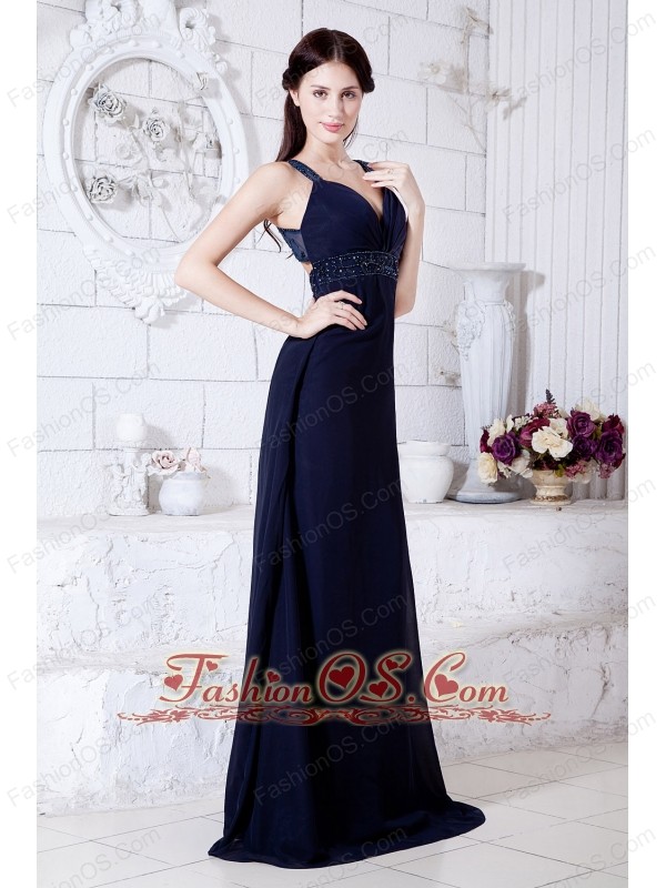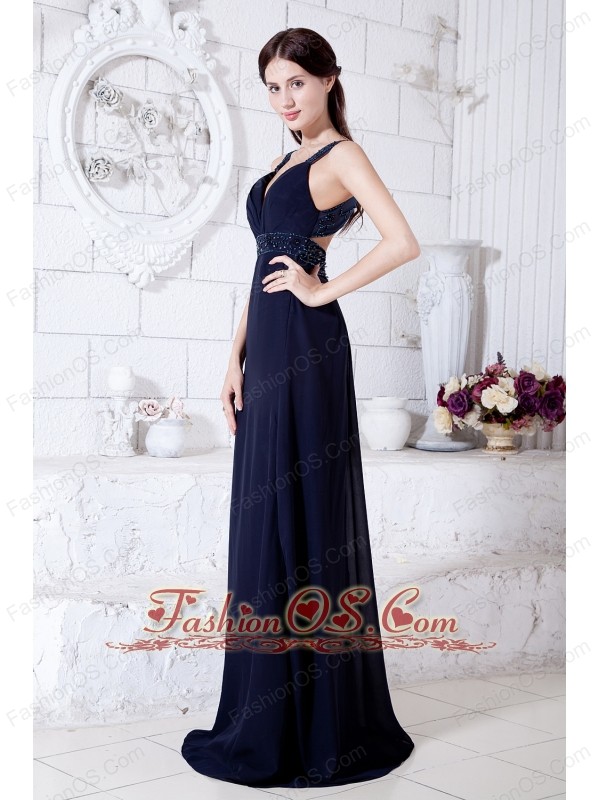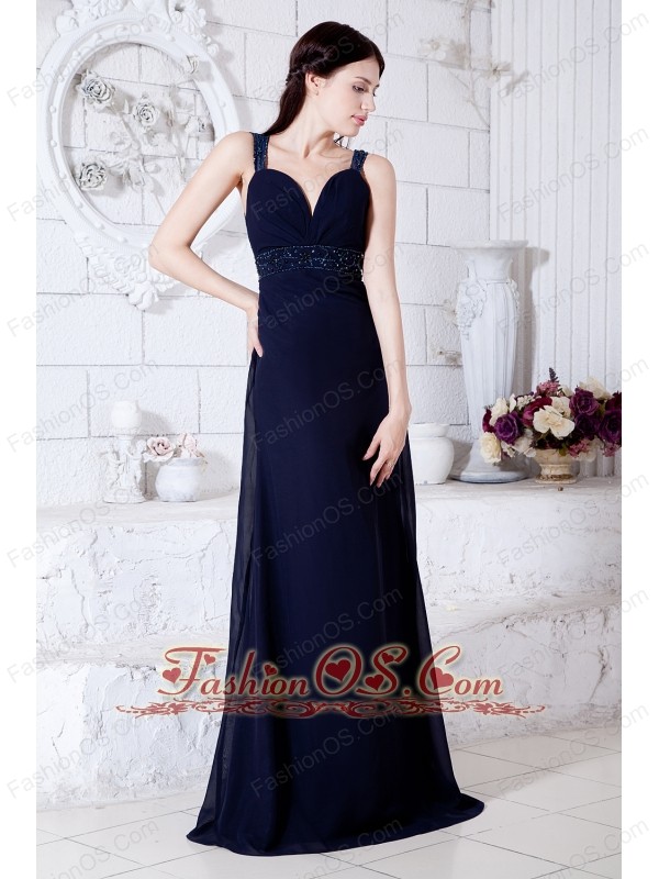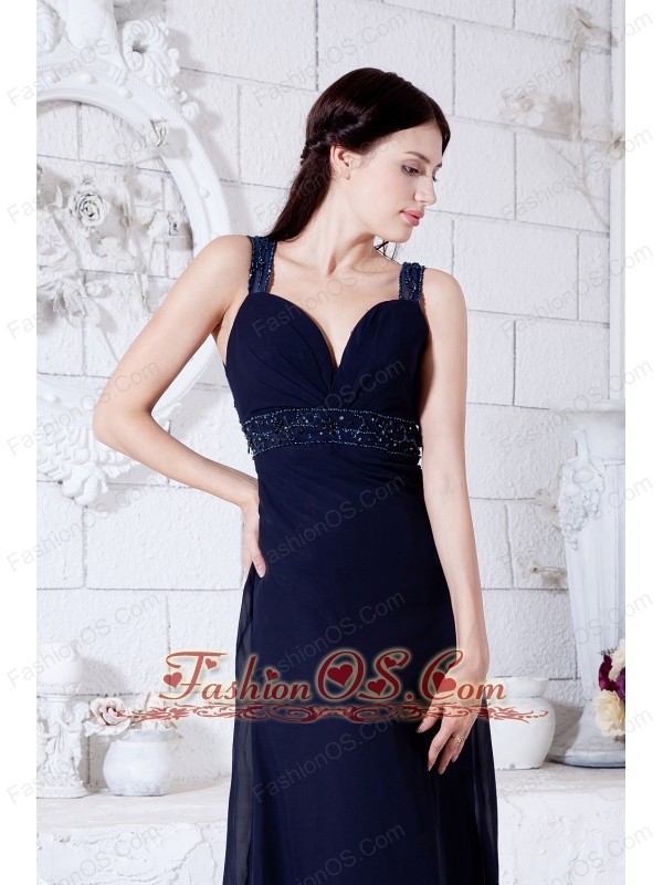 Navy Blue Empire Straps Prom / Evening Dress Brush Train Chiffon Beading