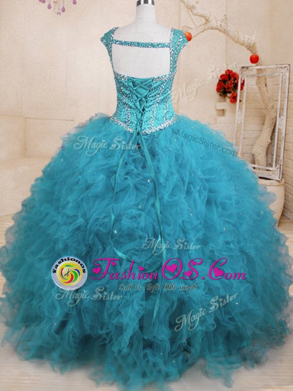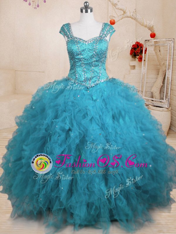 Designer Baby Blue Cap Sleeves Floor Length Beading and Ruffles Lace Up Sweet 16 Dresses