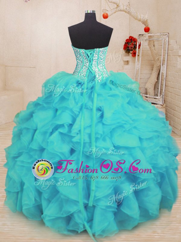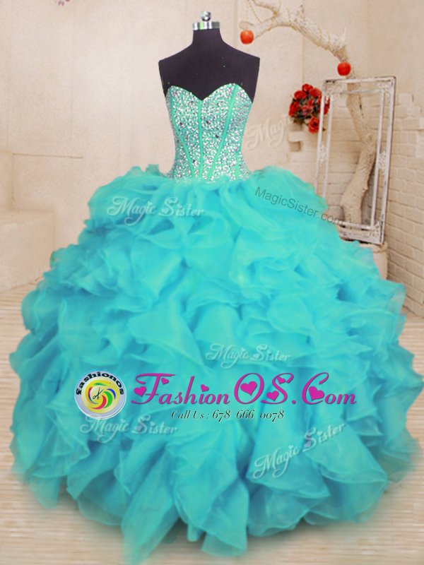 Fabulous Sweetheart Sleeveless Sweet 16 Dress Floor Length Beading and Ruffles Aqua Blue Organza