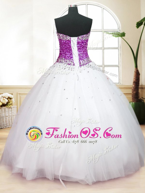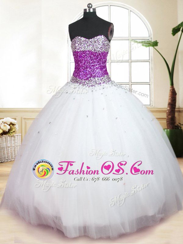 White Sleeveless Floor Length Beading Lace Up Sweet 16 Dresses