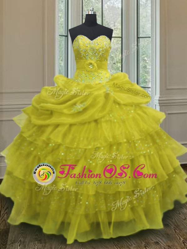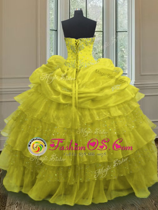 Stunning Yellow Organza Lace Up Sweetheart Sleeveless Floor Length Sweet 16 Quinceanera Dress Beading and Ruffled Layers and Pick Ups