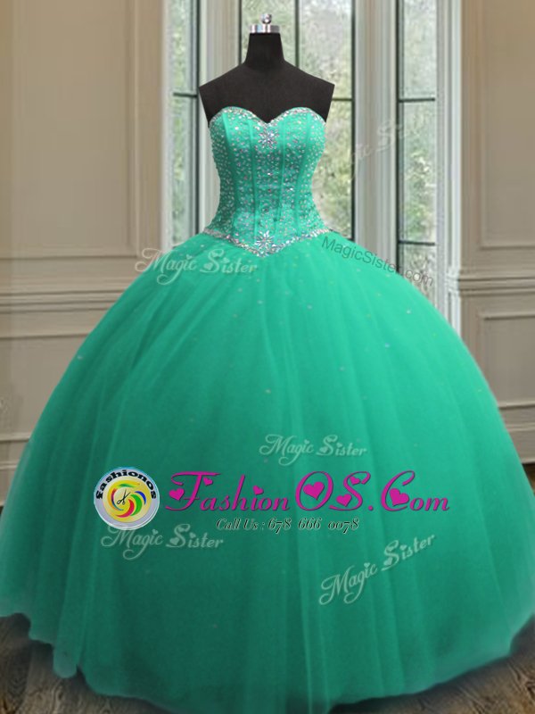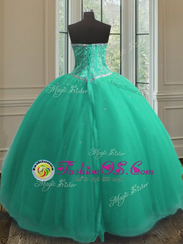 Sequins Ball Gowns 15th Birthday Dress Turquoise Sweetheart Tulle Sleeveless Floor Length Lace Up