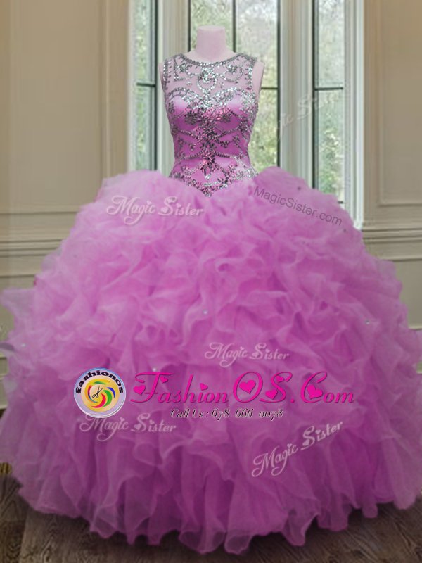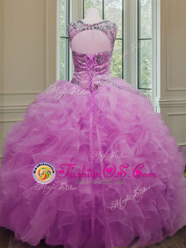 Sumptuous Scoop Fuchsia Lace Up Sweet 16 Dresses Beading and Ruffles Sleeveless Floor Length