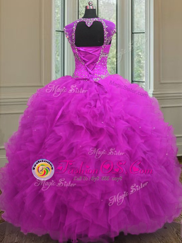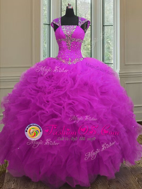 Affordable Fuchsia Organza Lace Up Straps Sleeveless Floor Length 15 Quinceanera Dress Beading and Ruffles and Sequins