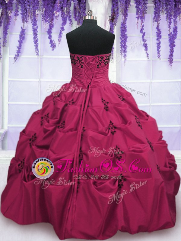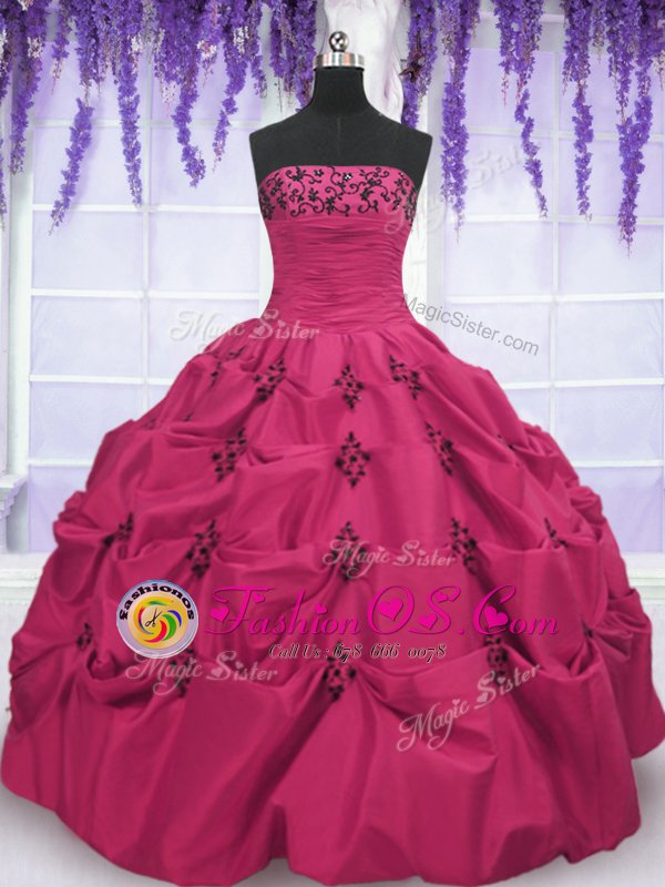 Hot Pink Lace Up Strapless Embroidery and Pick Ups 15th Birthday Dress Taffeta Sleeveless