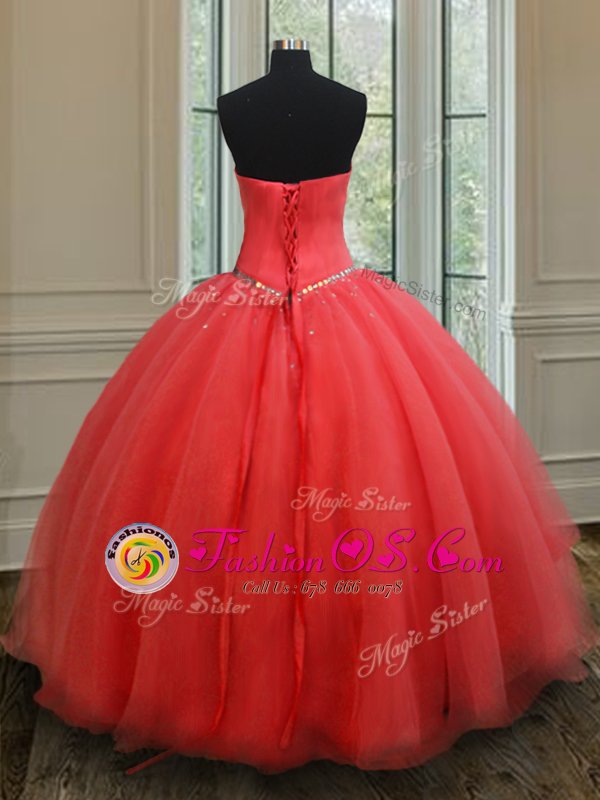 Coral Red Sleeveless Floor Length Beading Lace Up Vestidos de Quinceanera