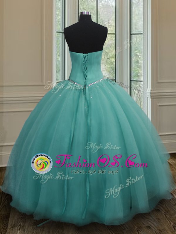 Sleeveless Floor Length Beading Lace Up Quinceanera Gowns with Turquoise