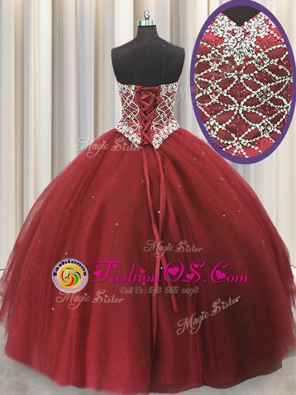 Sleeveless Floor Length Beading and Sequins Lace Up 15th Birthday Dress with Red