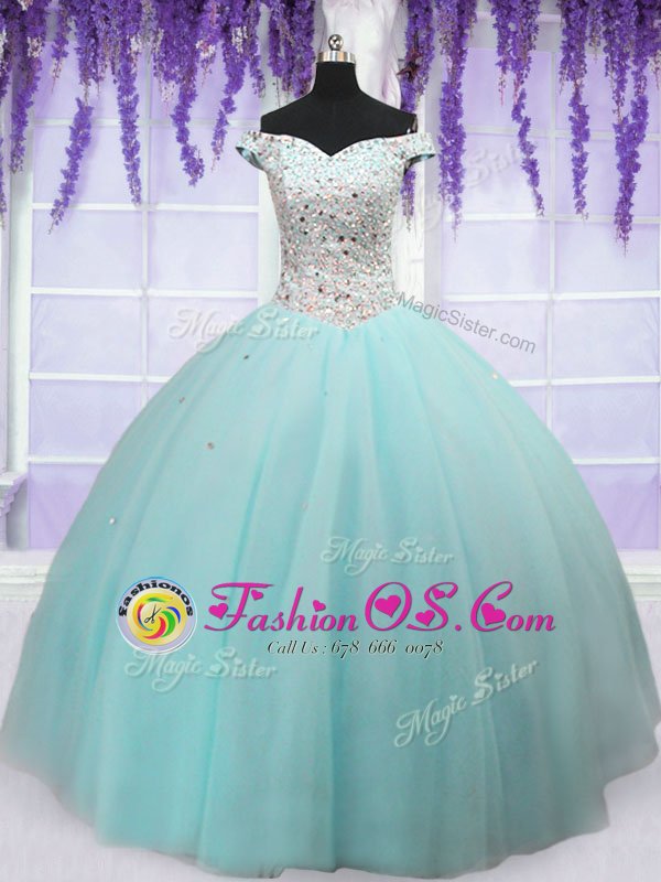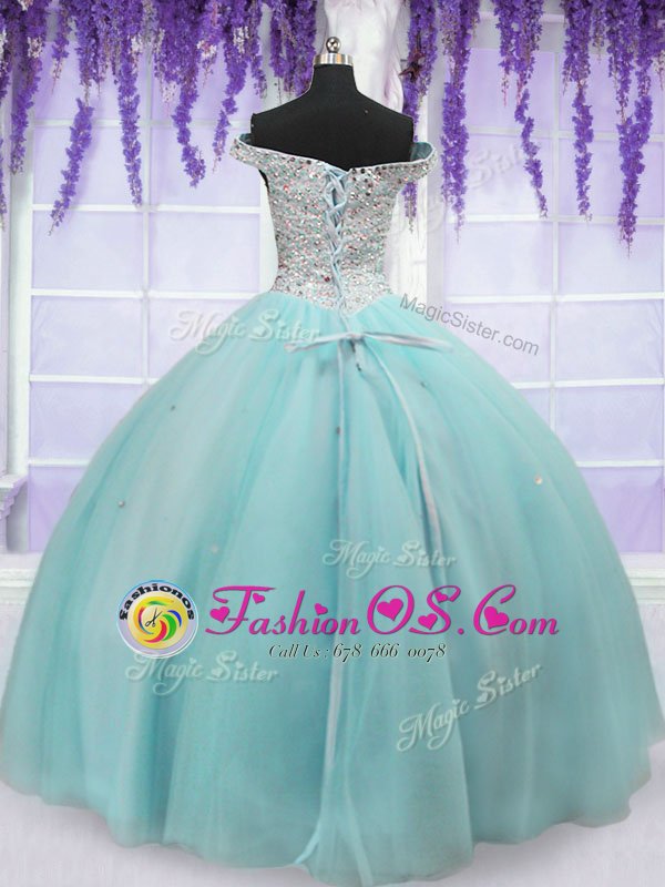Floor Length Light Blue Vestidos de Quinceanera Off The Shoulder Short Sleeves Lace Up