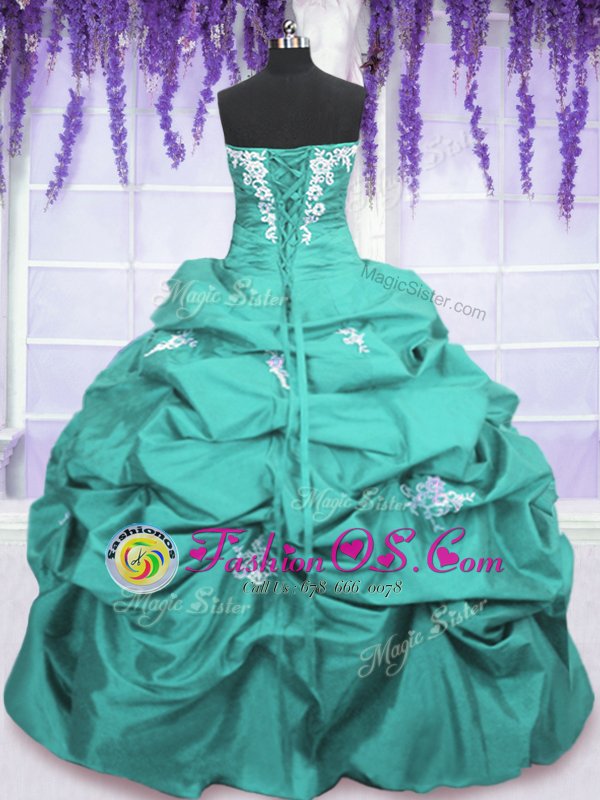 Extravagant Floor Length Lace Up Sweet 16 Dress Aqua Blue and In for Military Ball and Sweet 16 and Quinceanera with Appliques and Ruching and Pick Ups