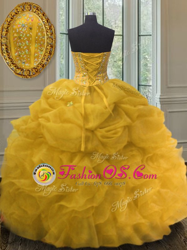 Decent Organza Sweetheart Sleeveless Lace Up Beading and Ruffles and Pick Ups Quinceanera Gown in Gold