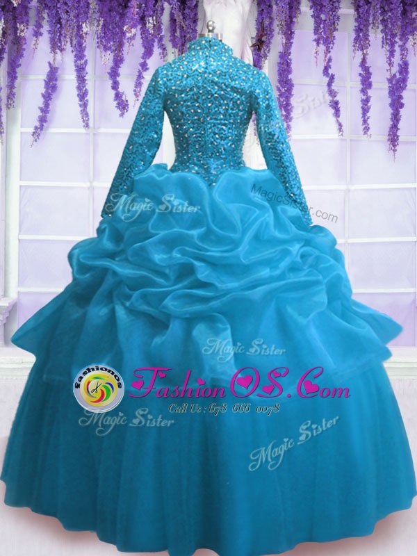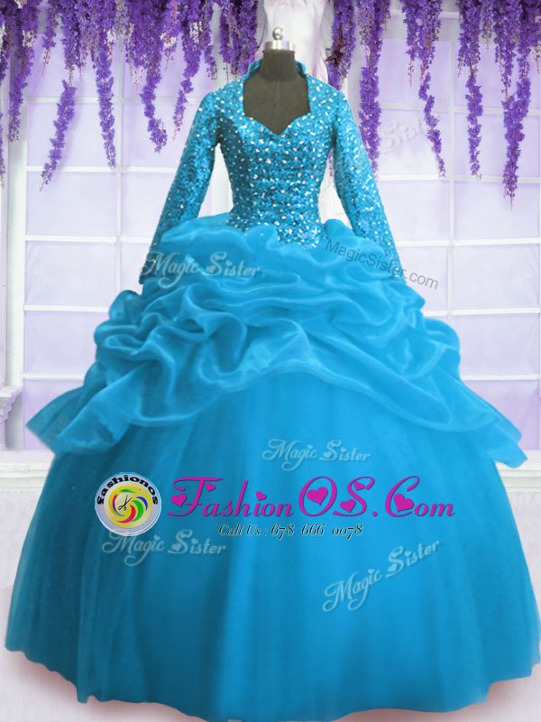 V-neck Long Sleeves Quince Ball Gowns Floor Length Sequins and Pick Ups Baby Blue Organza