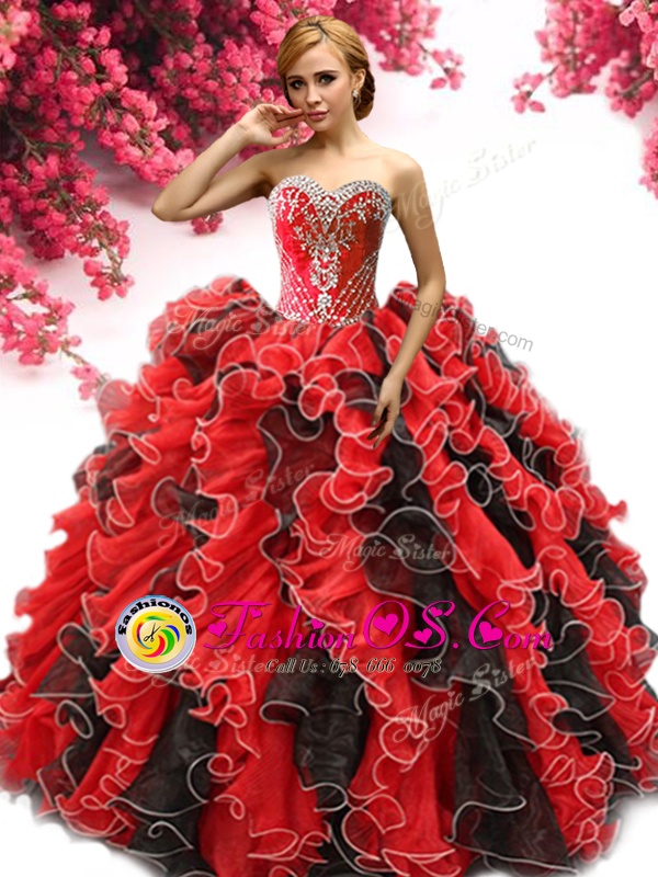 Top Selling Sleeveless Organza Floor Length Lace Up Quinceanera Gown in Red And Black for with Beading and Ruffles