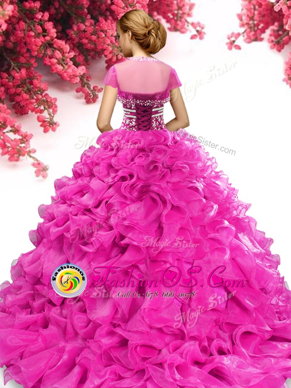 Glorious Hot Pink Organza Lace Up Sweet 16 Quinceanera Dress Sleeveless Sweep Train Beading and Ruffles