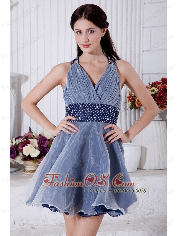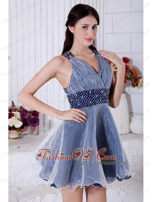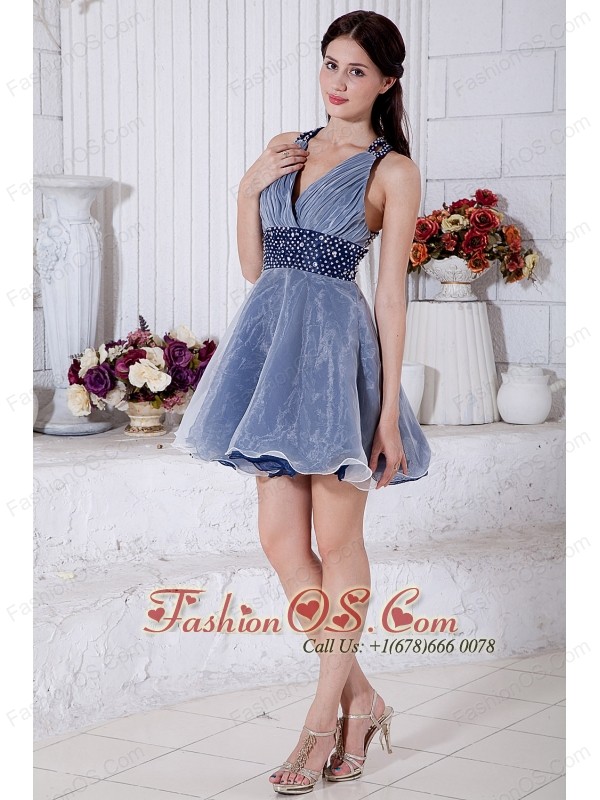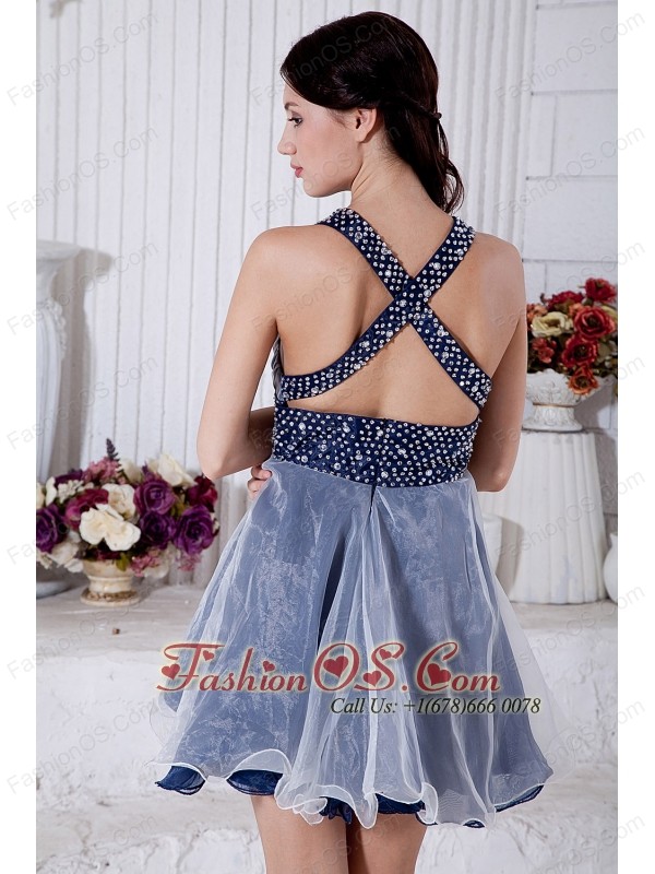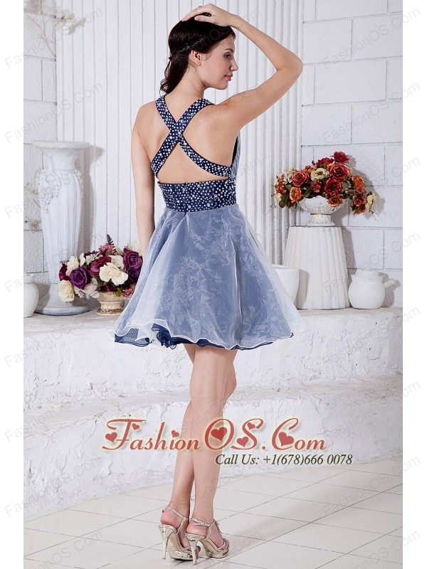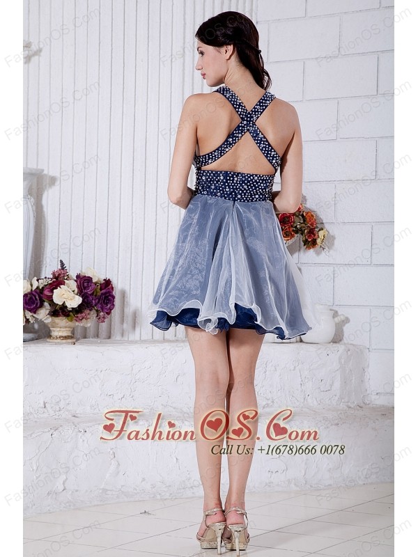 Blue and White A-line V-neck Short Prom / Homecoming Dress Organza Beading Mini-length