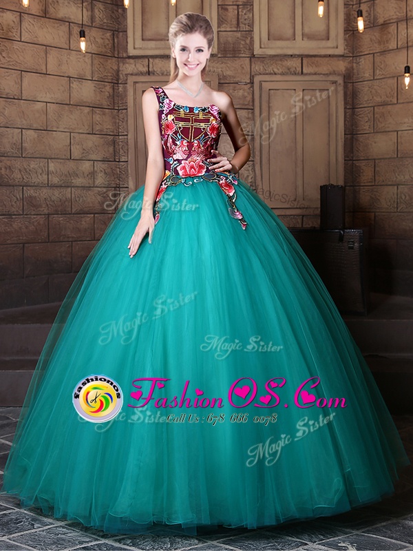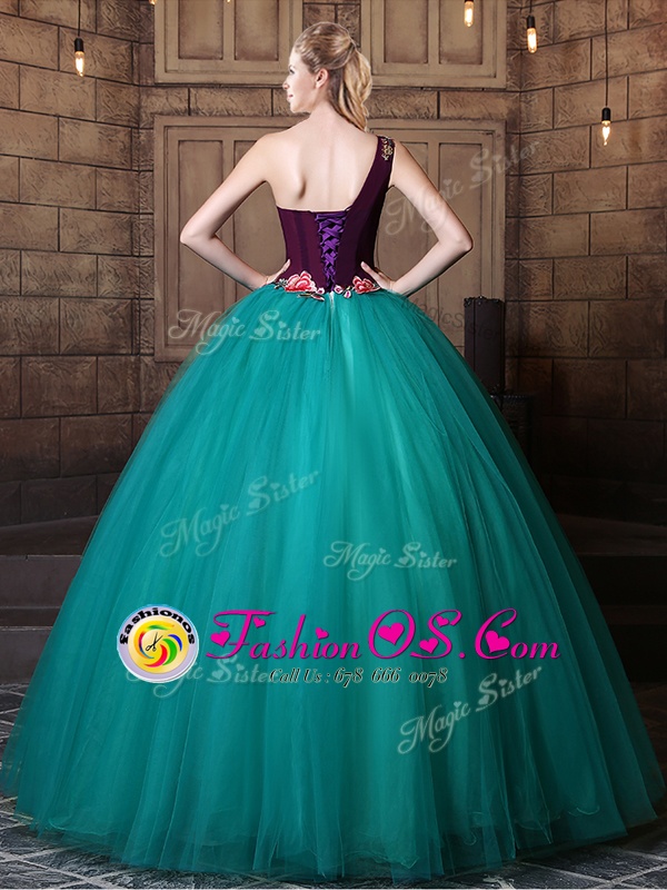 Affordable One Shoulder Sleeveless Lace Up Quinceanera Gowns Olive Green Tulle