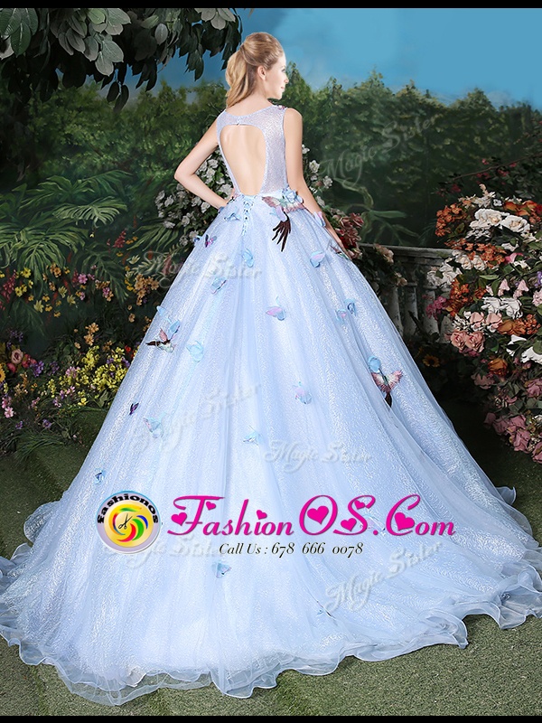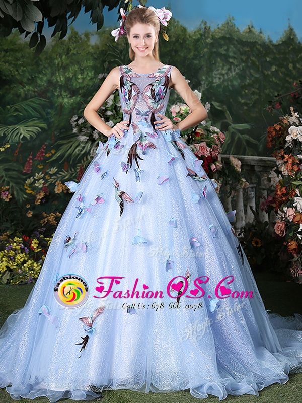 Scoop Light Blue Sleeveless Brush Train Appliques Floor Length Sweet 16 Quinceanera Dress